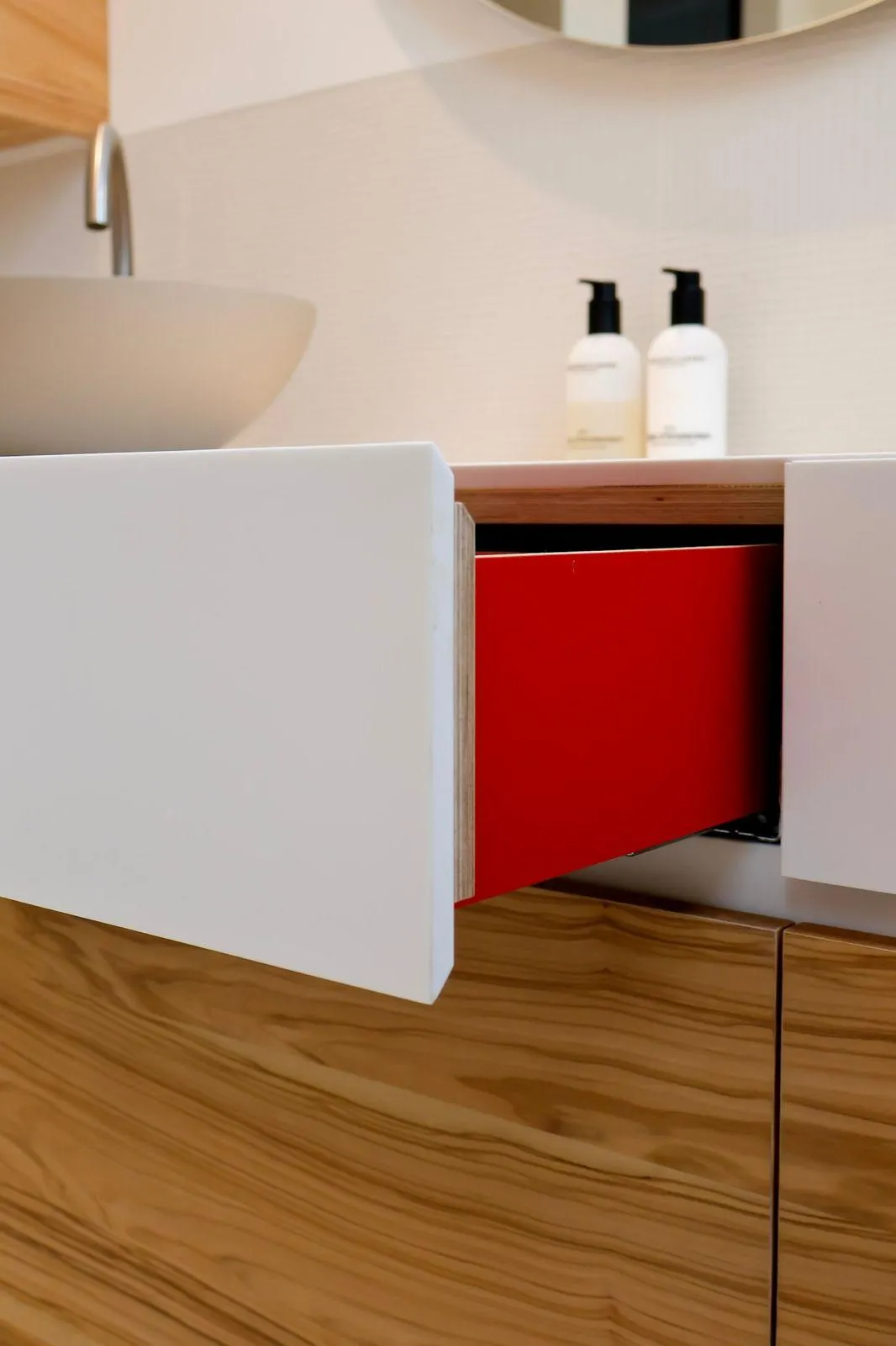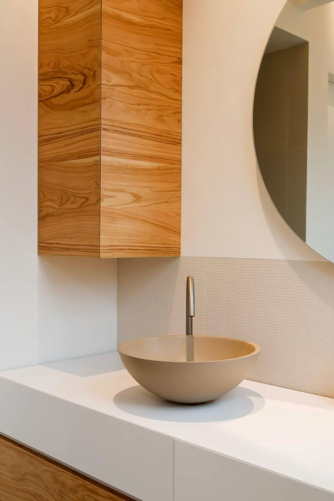 Het maatwerk wastafelmeubel - uitgevoerd in olijfhout.en solid surface - biedt royale opbergruimte, uit het zicht voor een rustige en opgeruimde beleving.